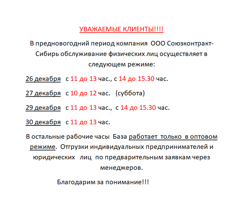 График работы ООО «Союзконтракт-Сибирь» ноябрьские праздничные дни